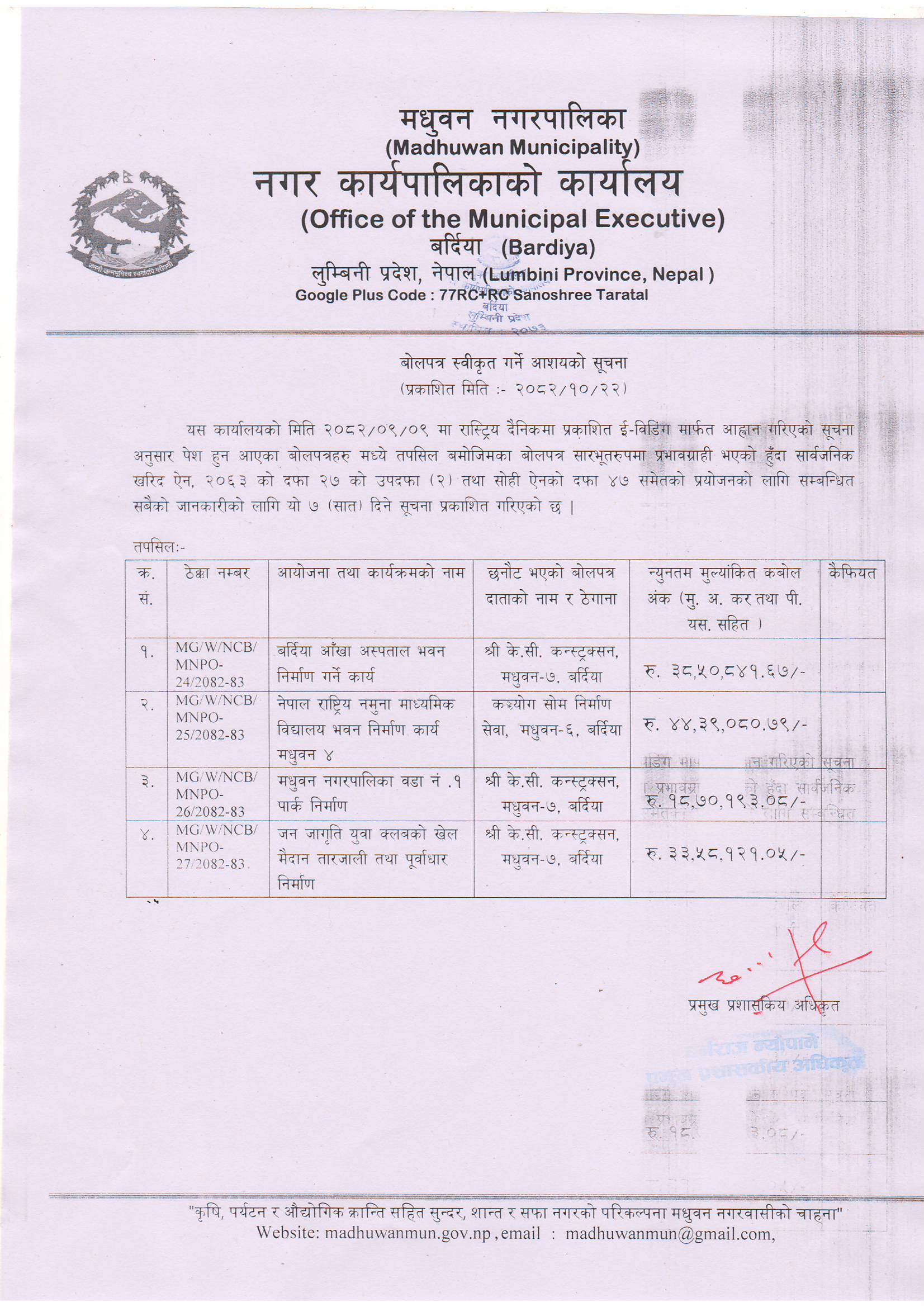 » बोलपत्र स्वीकृत गर्ने आशयको सूचना ।।