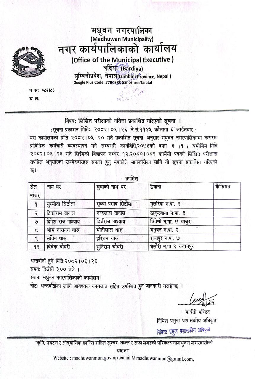 लिखित परीक्षाको नतिजा प्रकाशित गरिएको सुचना ।।।