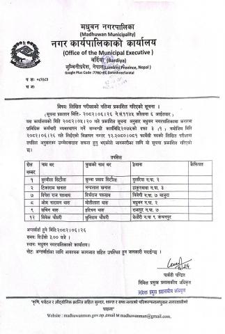 मधुवन नगरपालिकाको सल्लाहकार तथा परामर्शदाता नियुक्ति सम्बन्धी कार्यविधि,२०८२ ।।