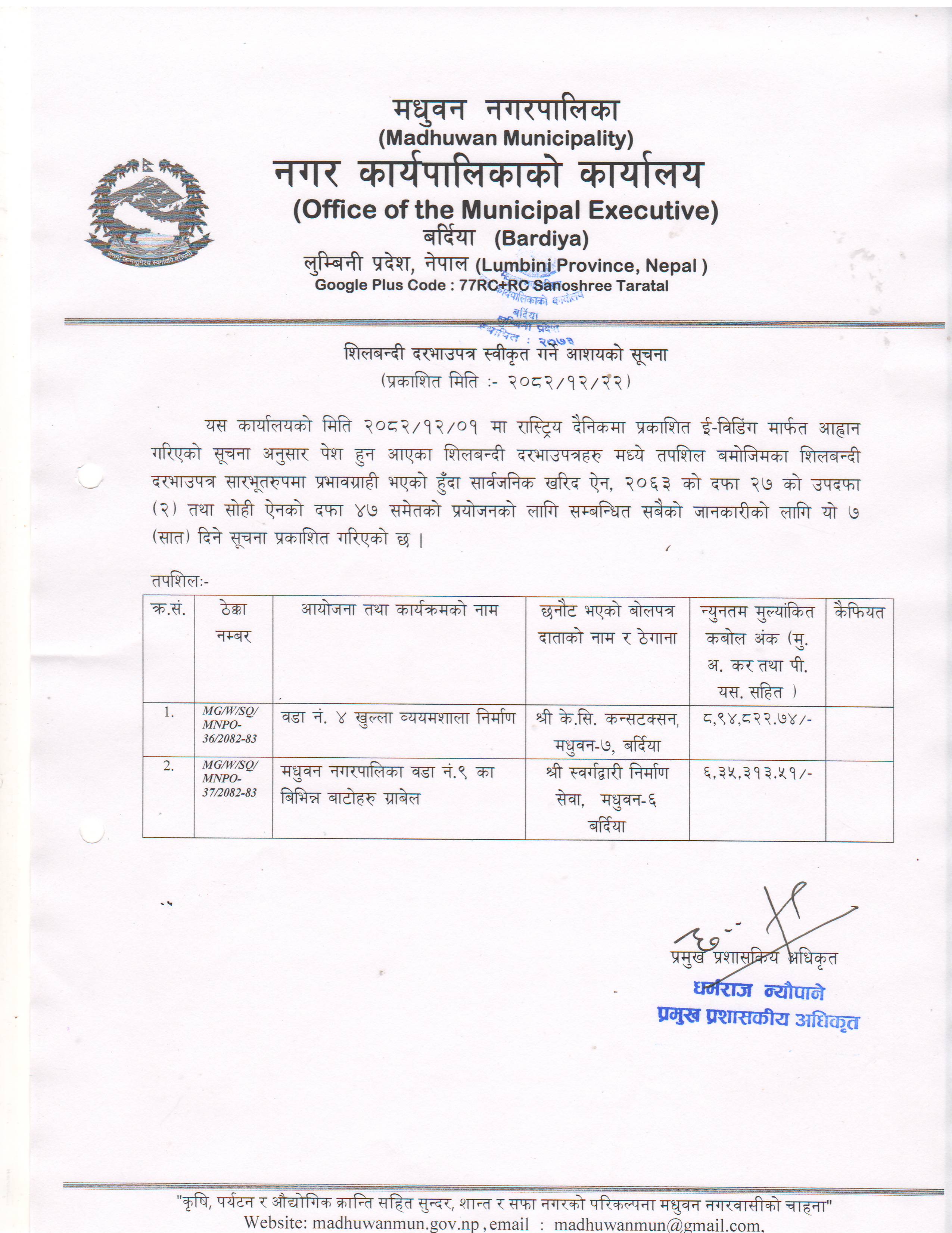 » शिलबन्दी दरभाउपत्र स्वीकृत गर्ने आशयको सूचना ।।।