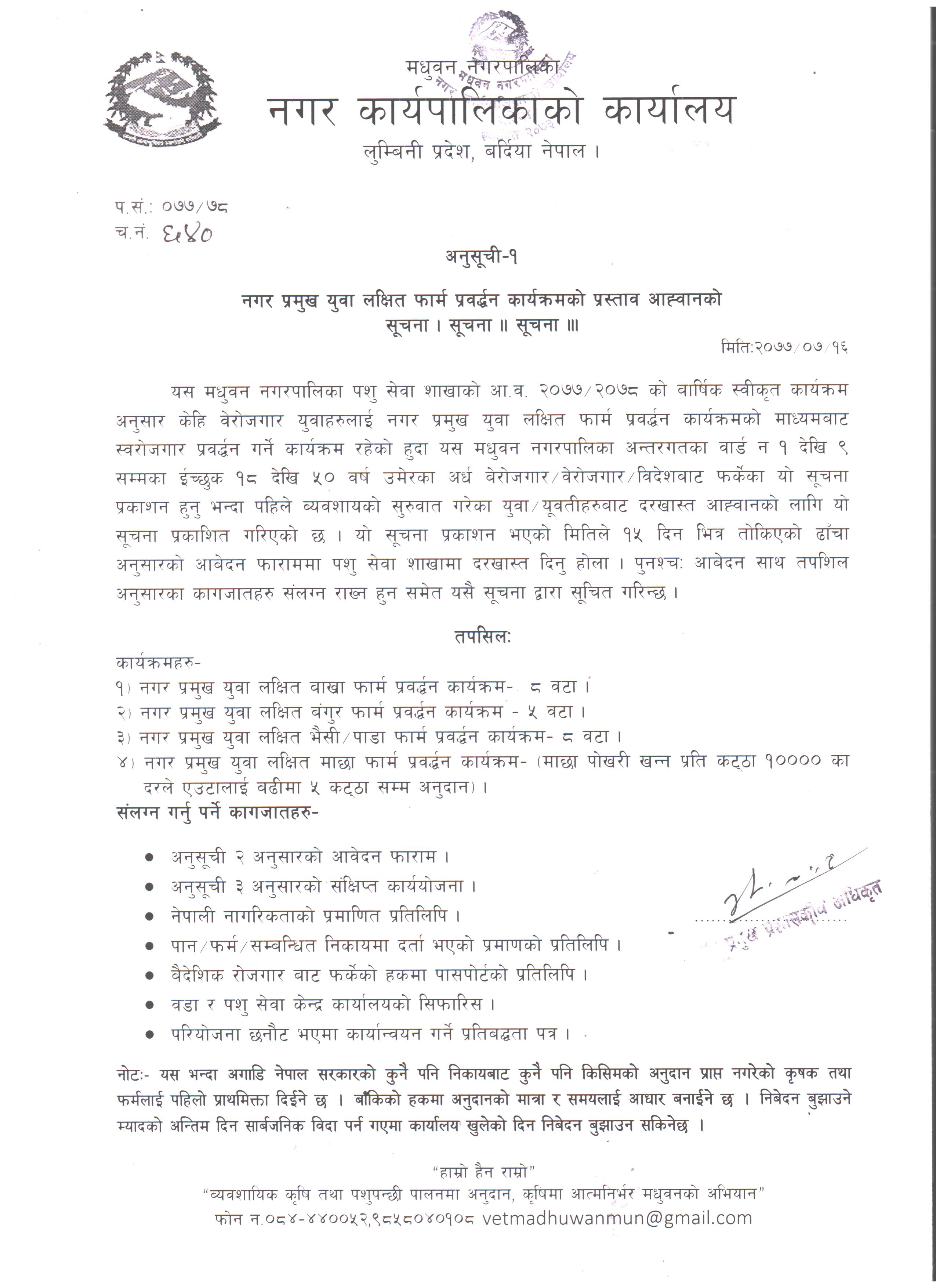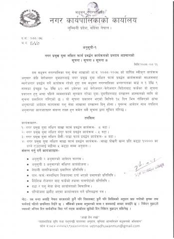 » नगर प्रमुख युवा लक्षित फार्म प्रवर्द्धन कार्यक्रमको प्रस्ताव आह्वानको सूचना !
