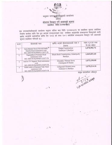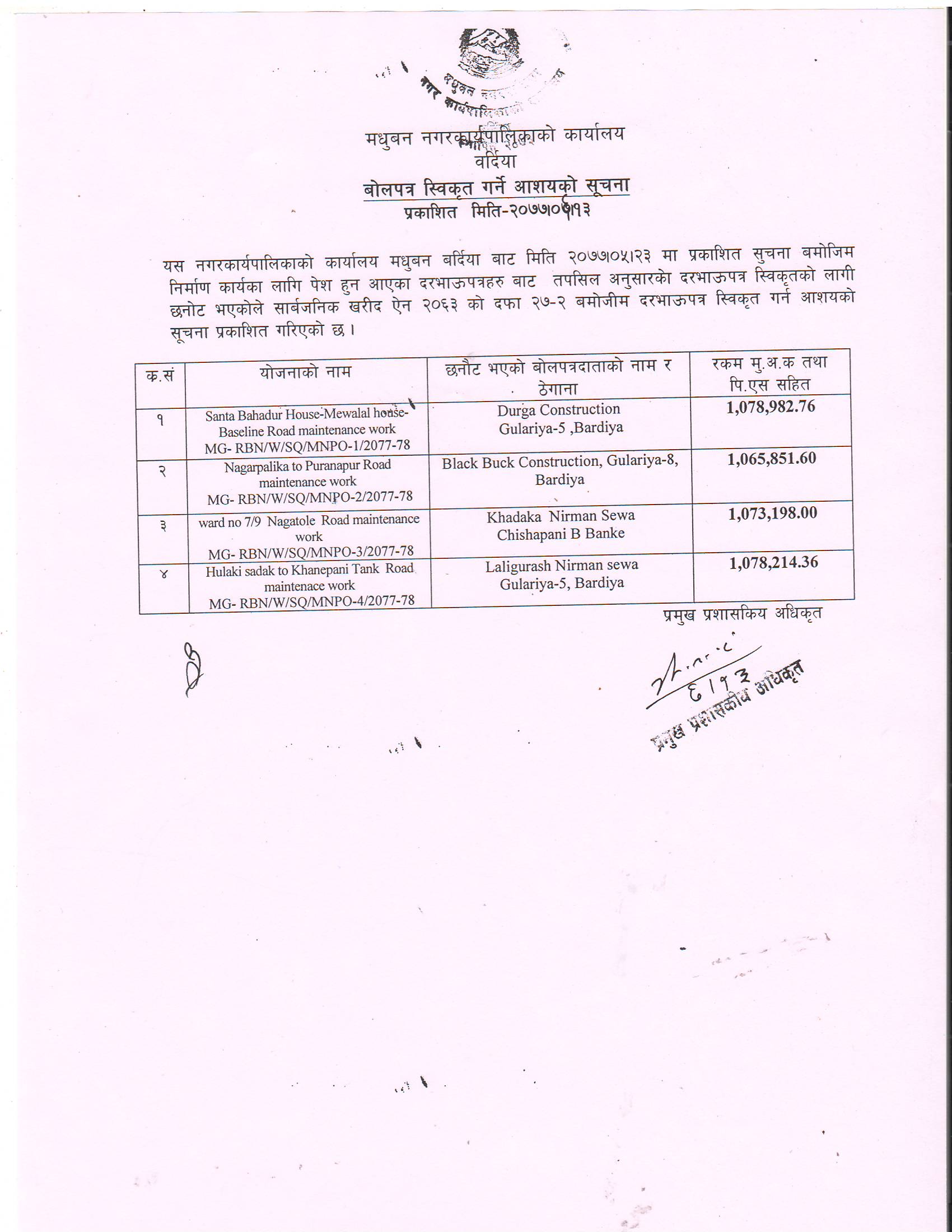 बोलपत्र स्विकृत गर्ने आशयकाे सूचना !