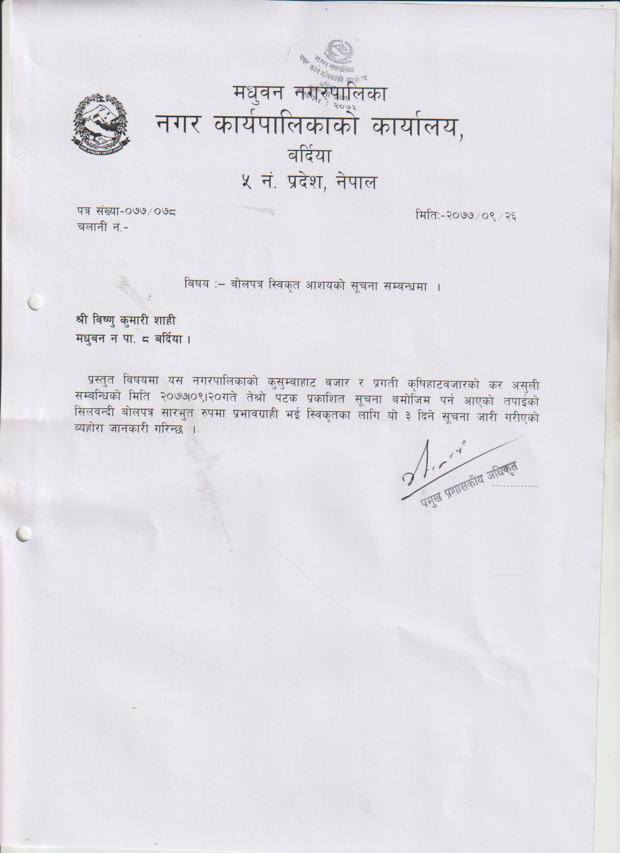 बोलपत्र स्वीकृत आशयको सुचना