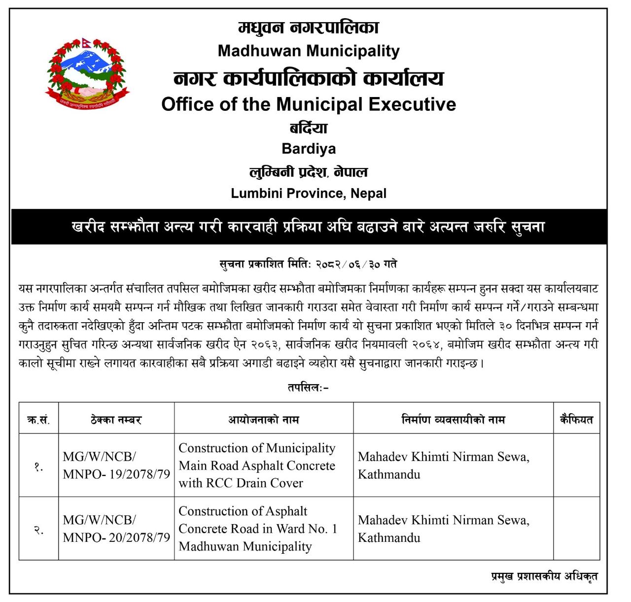 खरीद सम्झौता अन्त्य गरी कारवाही प्रक्रिया अघि बढाउने बारे अत्यन्त जरुरी सूचना ।।।
