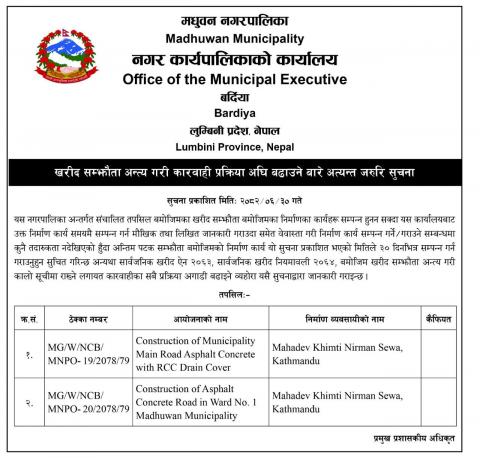 मधुवन नगरपालिका भएर बग्ने कर्णाली गेरुवा र बबई नदीबाट नदीजन्य पदार्थ (ढुंगा,गिट्टी तथा बालुवा) को उत्खनन्र संकलन र बिक्री वितरण सम्बन्धी टेन्डर/ विद्युतीय बोलपत्र (E-Bid) आह्वानको सूचना ।।।।