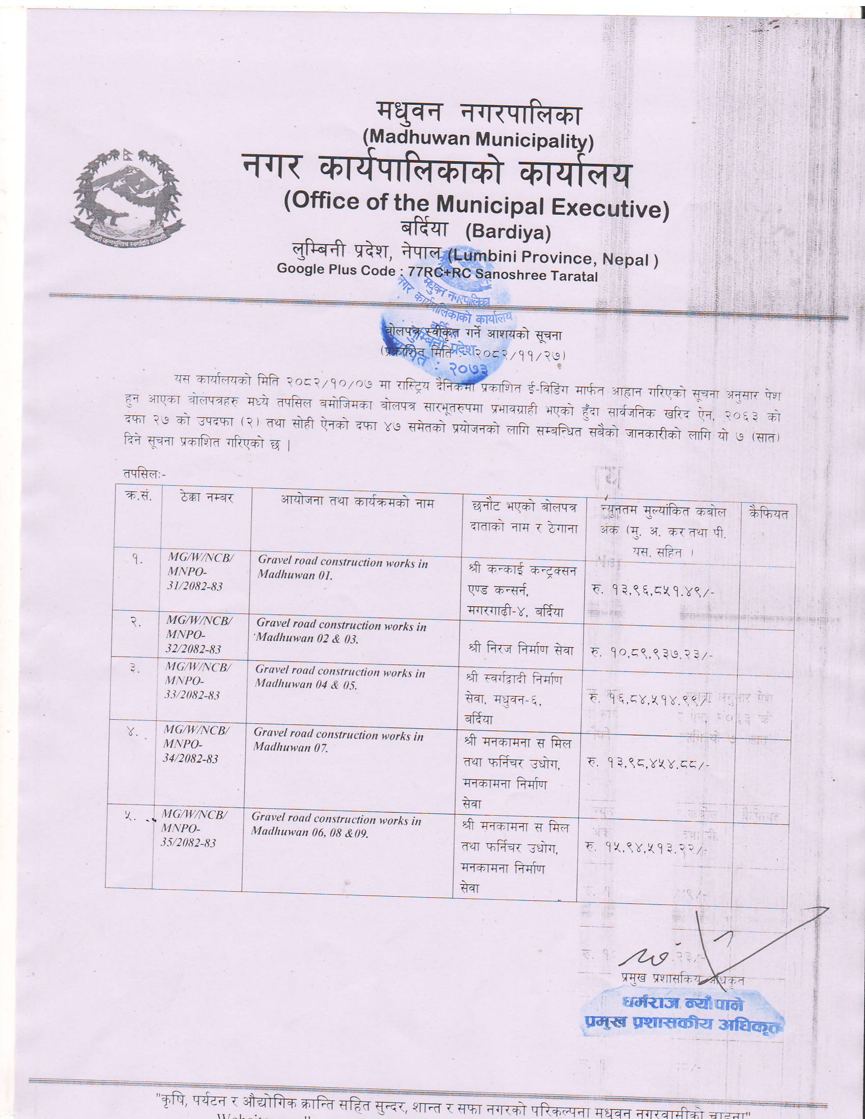 » बोलपत्र स्वीृकत गर्ने आशयको सूचना ।।।