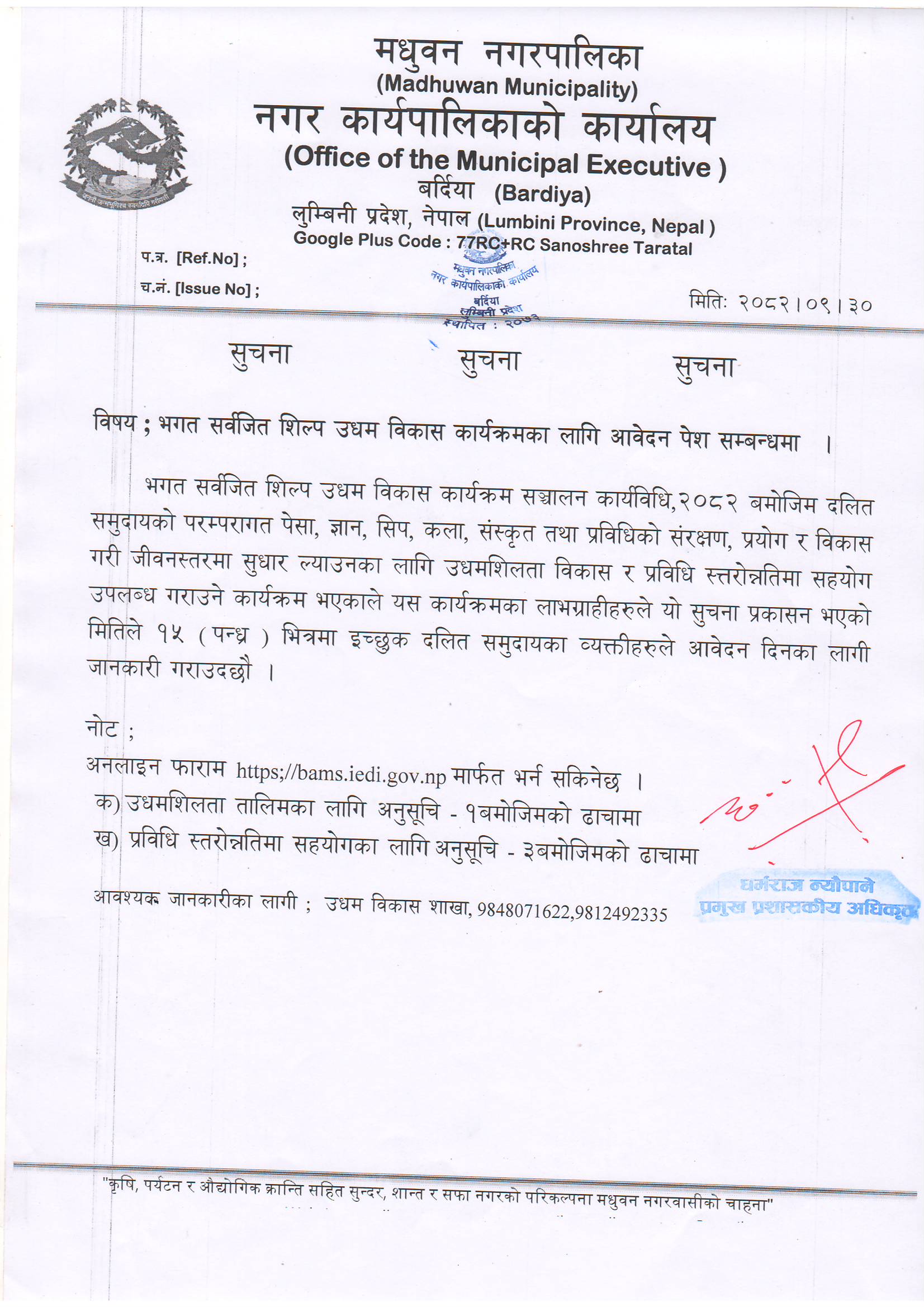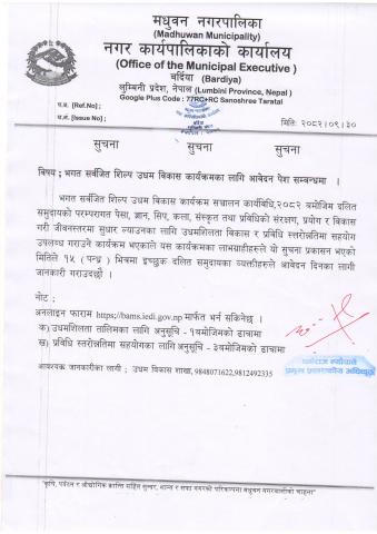 भगत सर्वजित शिल्प उद्यम विकास कार्यक्रमका लागि आवेदन पेश सम्बन्धमा ।।।