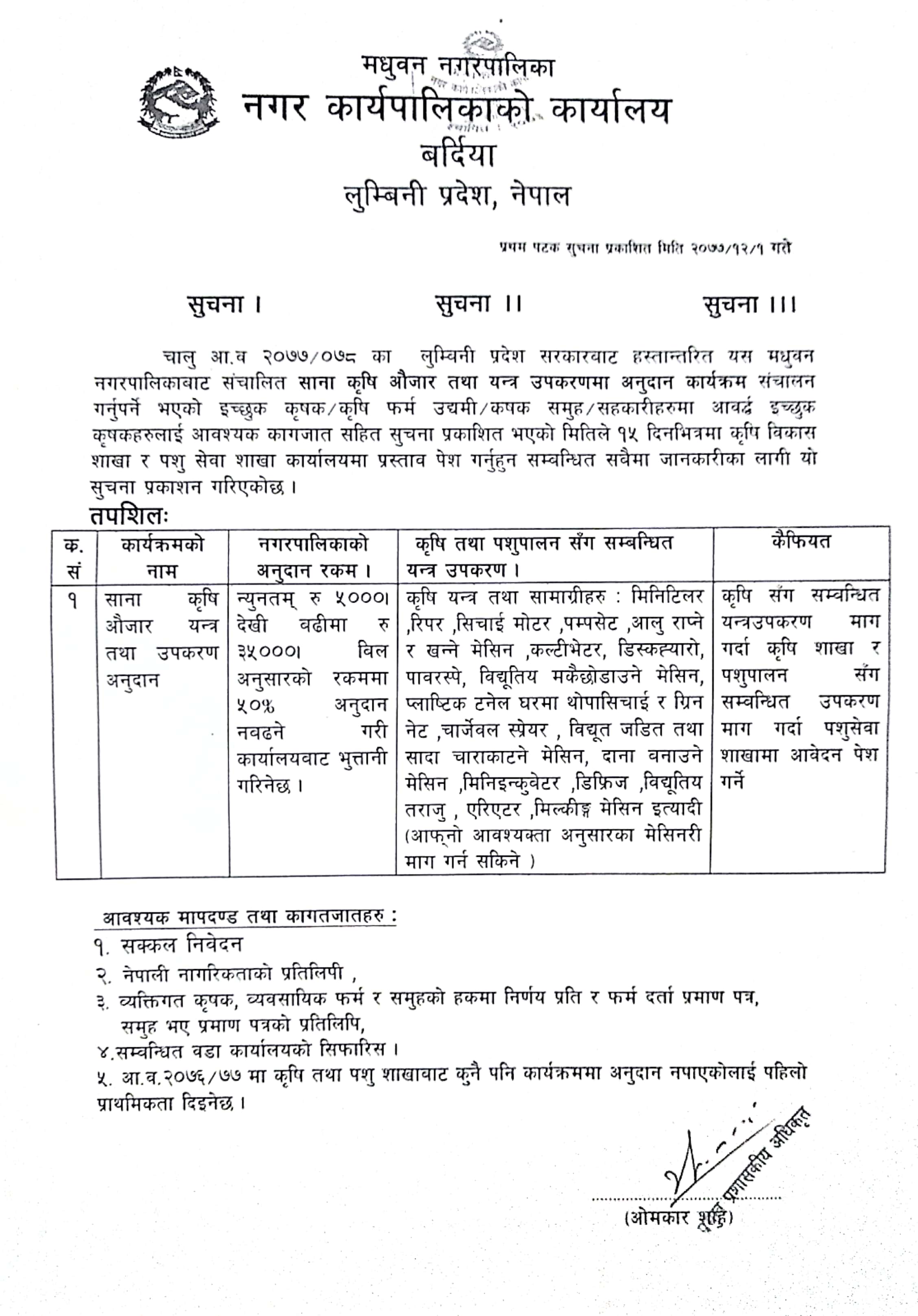 मधुवन नगरपालिकाको साना कृषि औजार तथा यन्त्र उपकरण अनुदान कार्यक्रम सम्बन्धि सूचना |