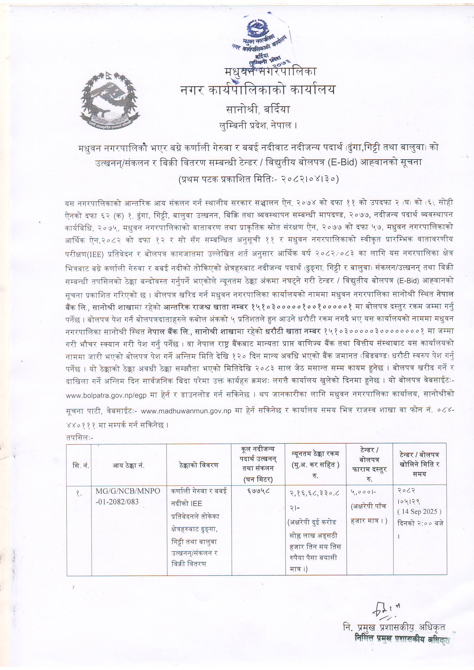 मधुवन नगरपालिका भएर बग्ने कर्णाली गेरुवा र बबई नदीबाट नदीजन्य पदार्थ (ढुंगा,गिट्टी तथा बालुवा) को उत्खनन्र संकलन र बिक्री वितरण सम्बन्धी टेन्डर/ विद्युतीय बोलपत्र (E-Bid) आह्वानको सूचना ।।।।