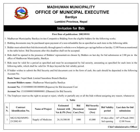 मधुवन नगरपालिका भएर बग्ने कर्णाली गेरुवा र बबई नदीबाट नदीजन्य पदार्थको उत्खनन्/संकलन र बिक्रीवितरण सम्बन्धी टेण्डर/ विद्युतिय बोलपत्र (E-Bid) आह्वानको सूचना ।।।